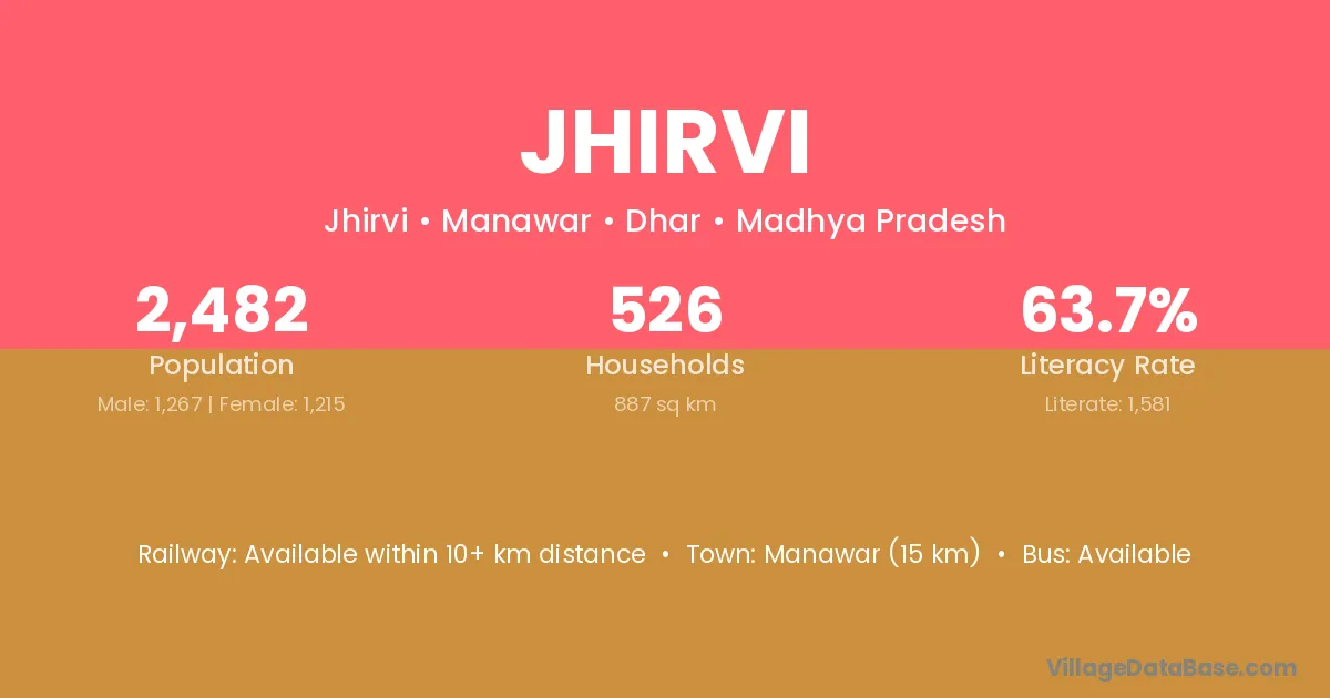 Manawar (15 km) is the nearest town to Jhirvi village for major economic activities and is located approximately 15 km away.