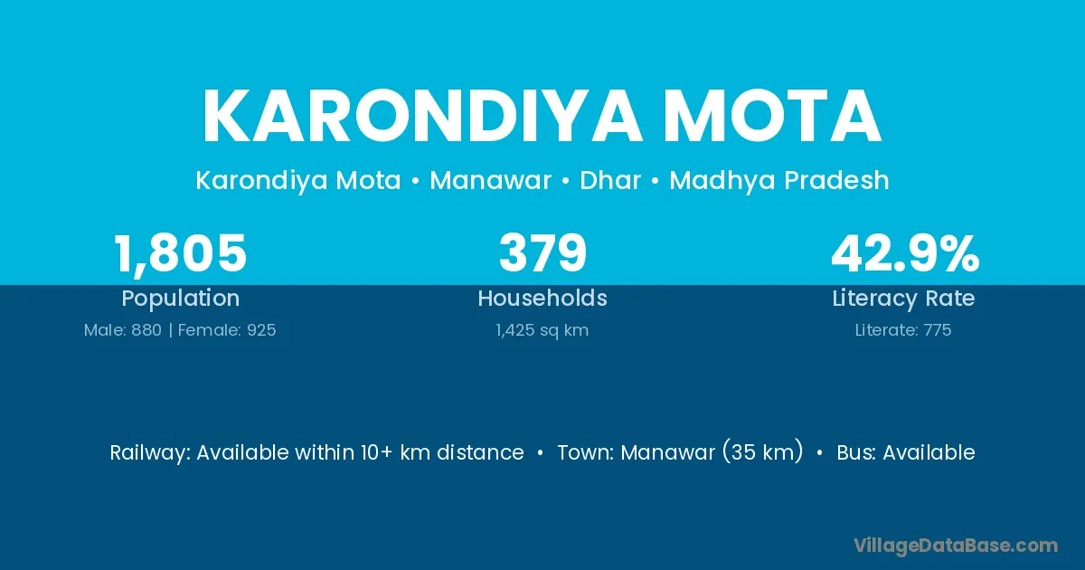Manawar (35 km) is the nearest town to Karondiya Mota village for major economic activities and is located approximately 35 km away.