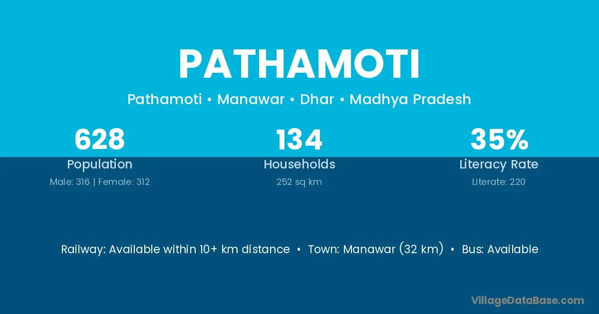 Manawar (32 km) is the nearest town to Pathamoti village for major economic activities and is located approximately 32 km away.