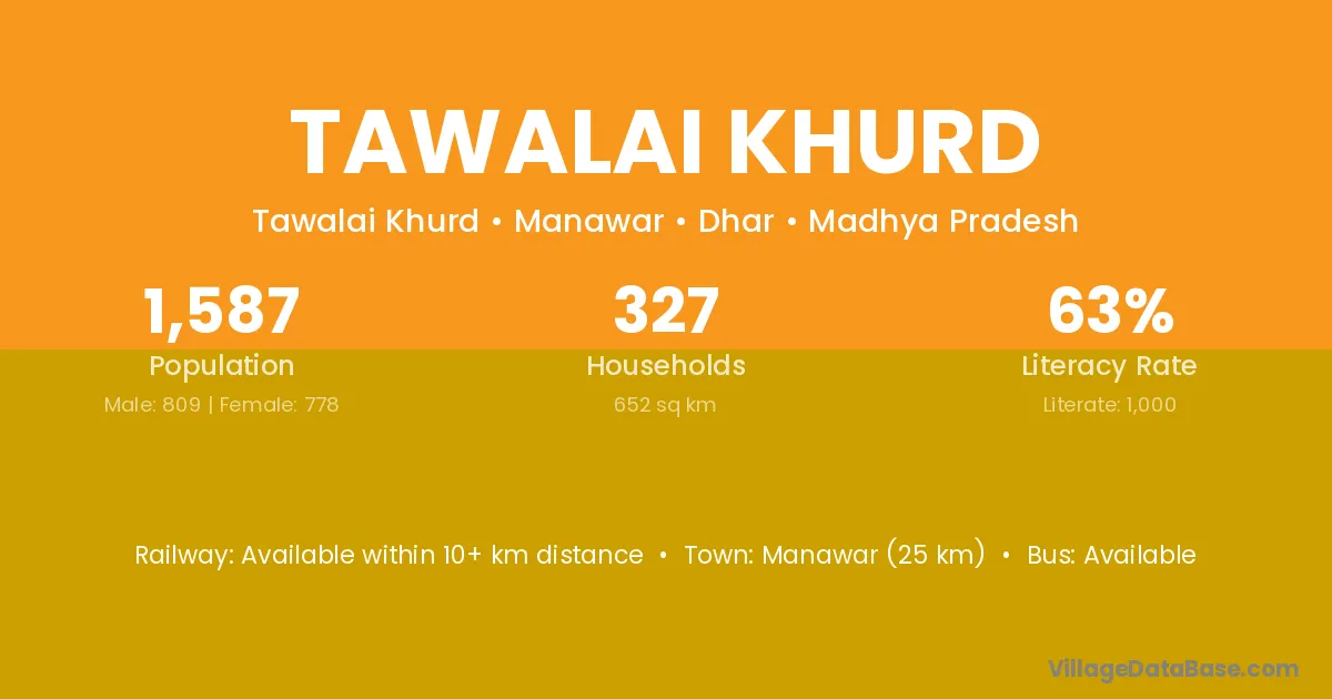 Manawar (25 km) is the nearest town to Tawalai Khurd village for major economic activities and is located approximately 25 km away.