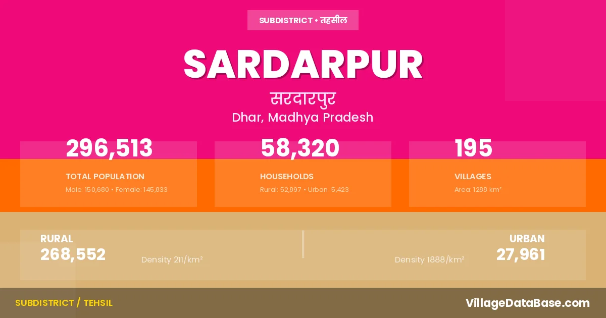 According to the 2011 census The total area of Sardarpur Tehsil is 1288 km², with a population of 296513 people. The population density is 230 inhabitants per square kilometre, and there are approximately 58320 houses in the sub district.