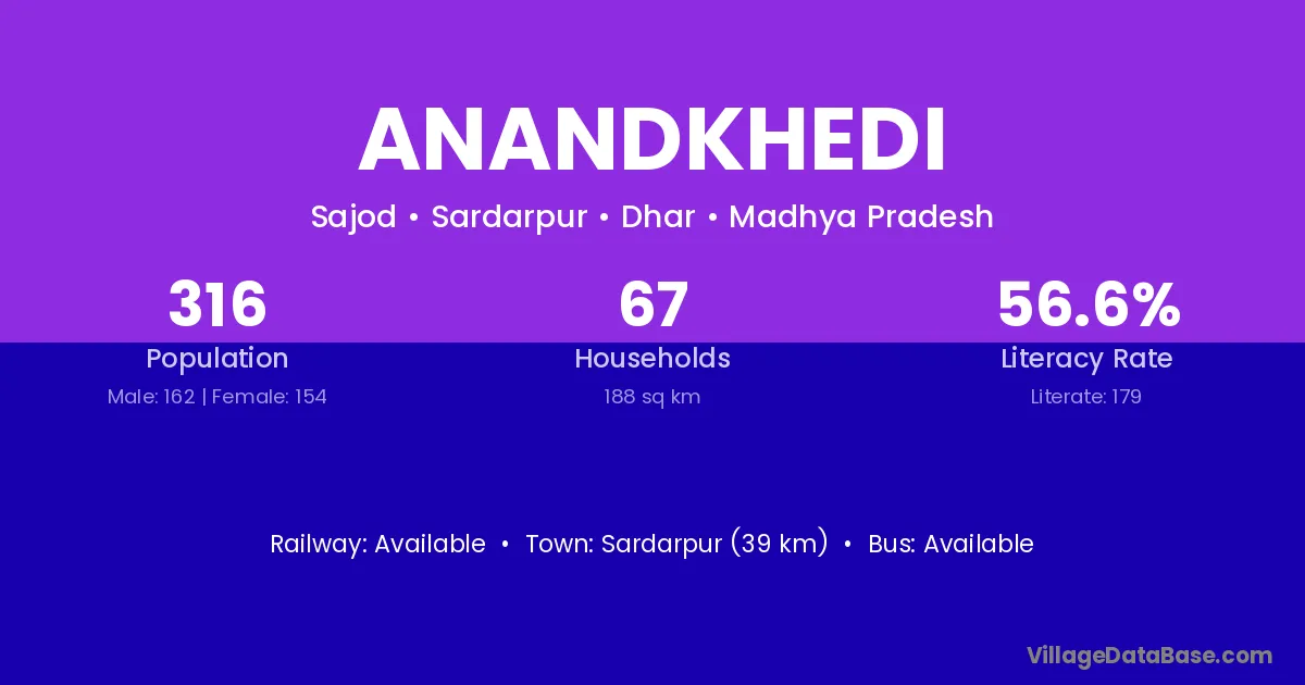 Sardarpur (39 km) is the nearest town to Anandkhedi village for major economic activities and is located approximately 39 km away.
