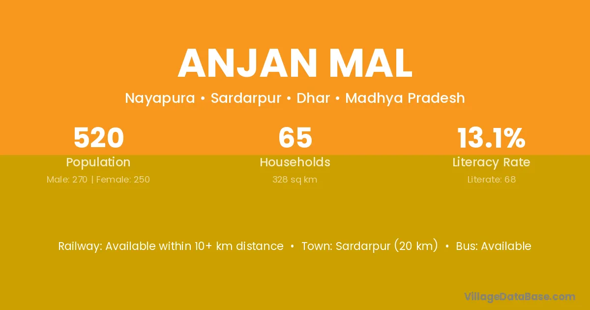 Sardarpur (20 km) is the nearest town to Anjan Mal village for major economic activities and is located approximately 20 km away.