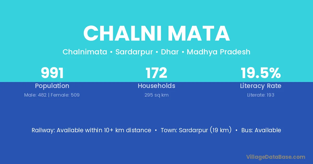 Sardarpur (19 km) is the nearest town to Chalni Mata village for major economic activities and is located approximately 19 km away.
