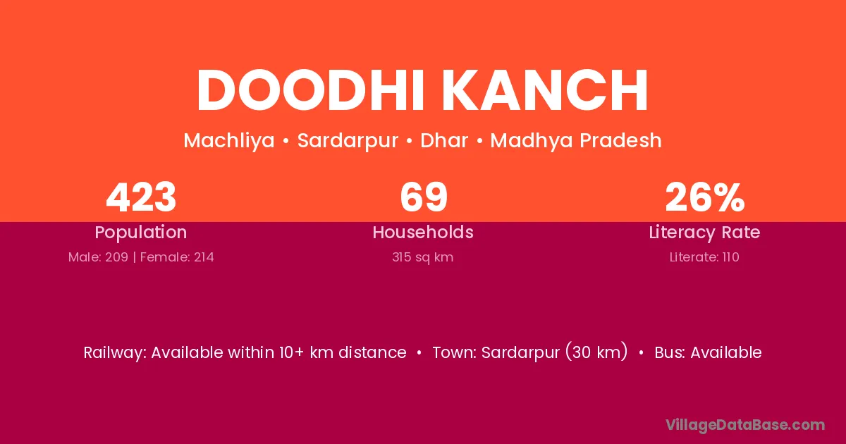 Sardarpur (30 km) is the nearest town to Doodhi Kanch village for major economic activities and is located approximately 30 km away.