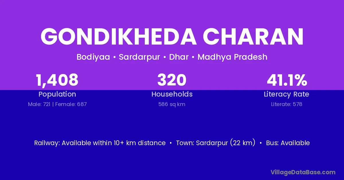 Sardarpur (22 km) is the nearest town to Gondikheda Charan village for major economic activities and is located approximately 22 km away.