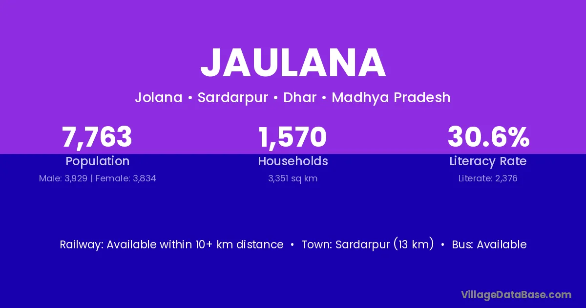 Sardarpur (13 km) is the nearest town to Jaulana village for major economic activities and is located approximately 13 km away.