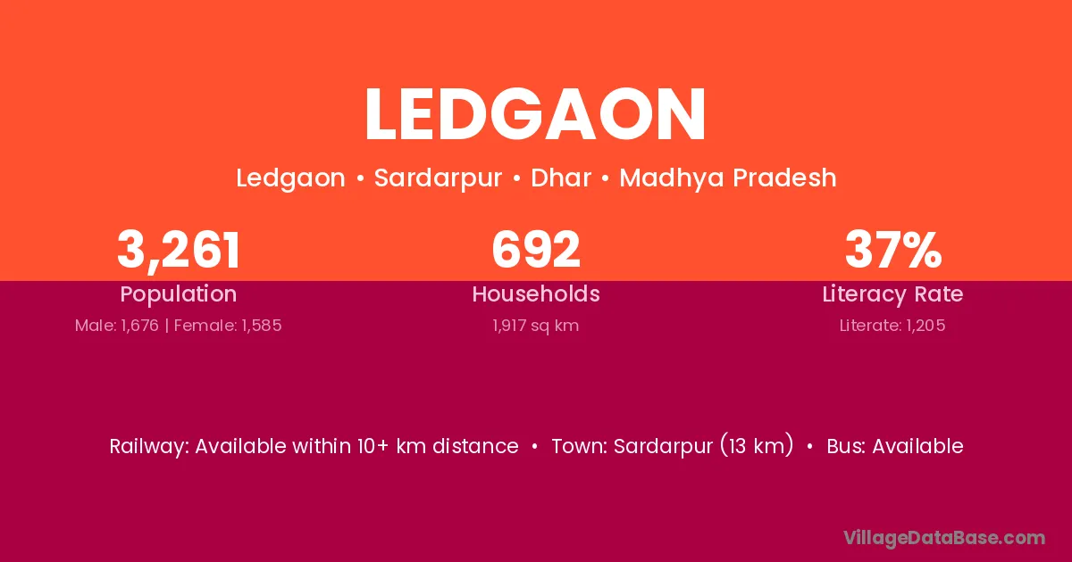 Sardarpur (13 km) is the nearest town to Ledgaon village for major economic activities and is located approximately 13 km away.