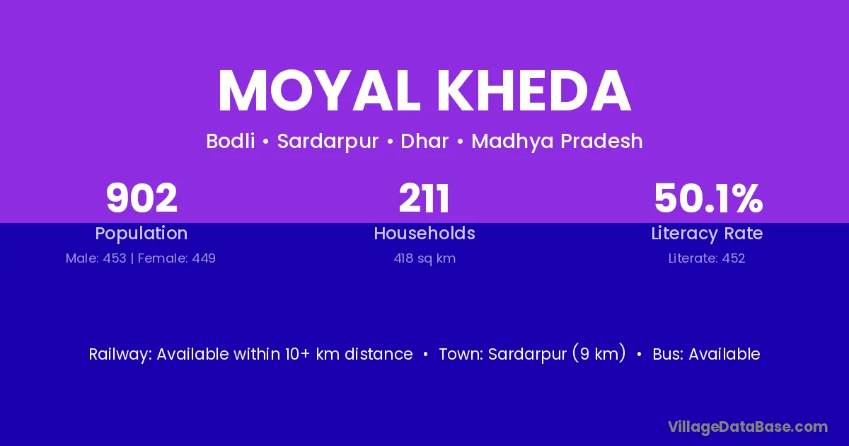 Sardarpur (9 km) is the nearest town to Moyal Kheda village for major economic activities and is located approximately 9 km away.