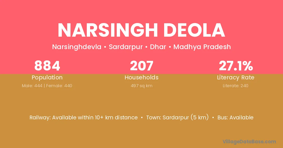 Sardarpur (5 km) is the nearest town to Narsingh Deola village for major economic activities and is located approximately 5 km away.