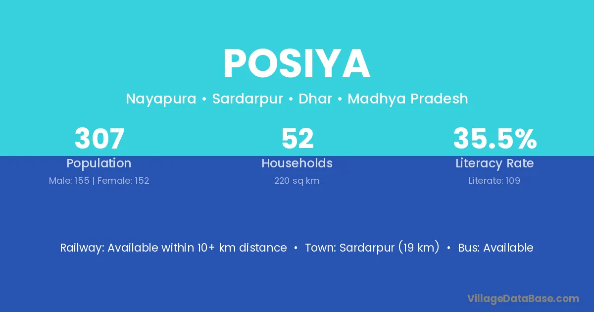 Sardarpur (19 km) is the nearest town to Posiya village for major economic activities and is located approximately 19 km away.