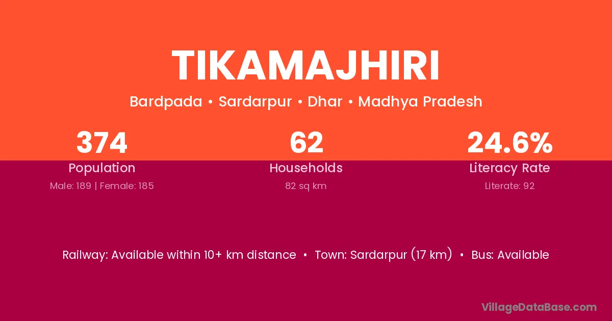 Sardarpur (17 km) is the nearest town to Tikamajhiri village for major economic activities and is located approximately 17 km away.