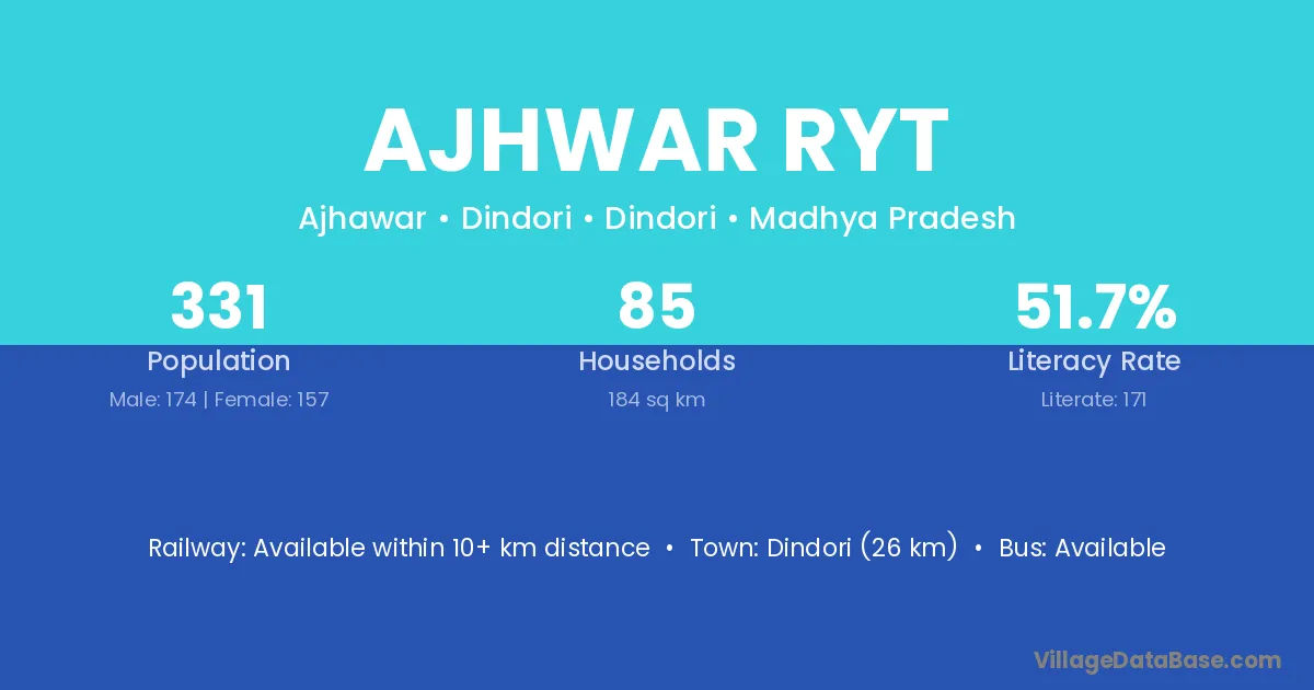 Dindori (26 km) is the nearest town to Ajhwar Ryt village for major economic activities and is located approximately 26 km away.