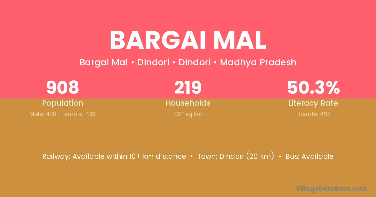 Bargai Mal village has a total population of 908 people, of which 470 are males and 438 are females.