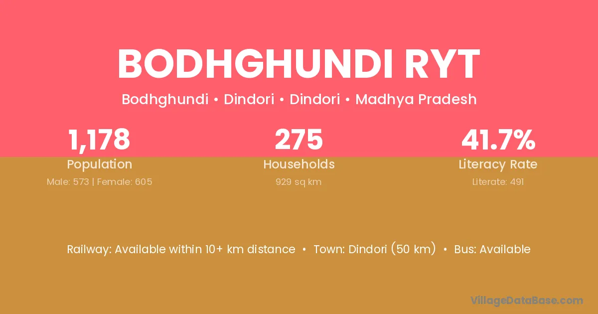 Dindori (50 km) is the nearest town to Bodhghundi Ryt village for major economic activities and is located approximately 50 km away.