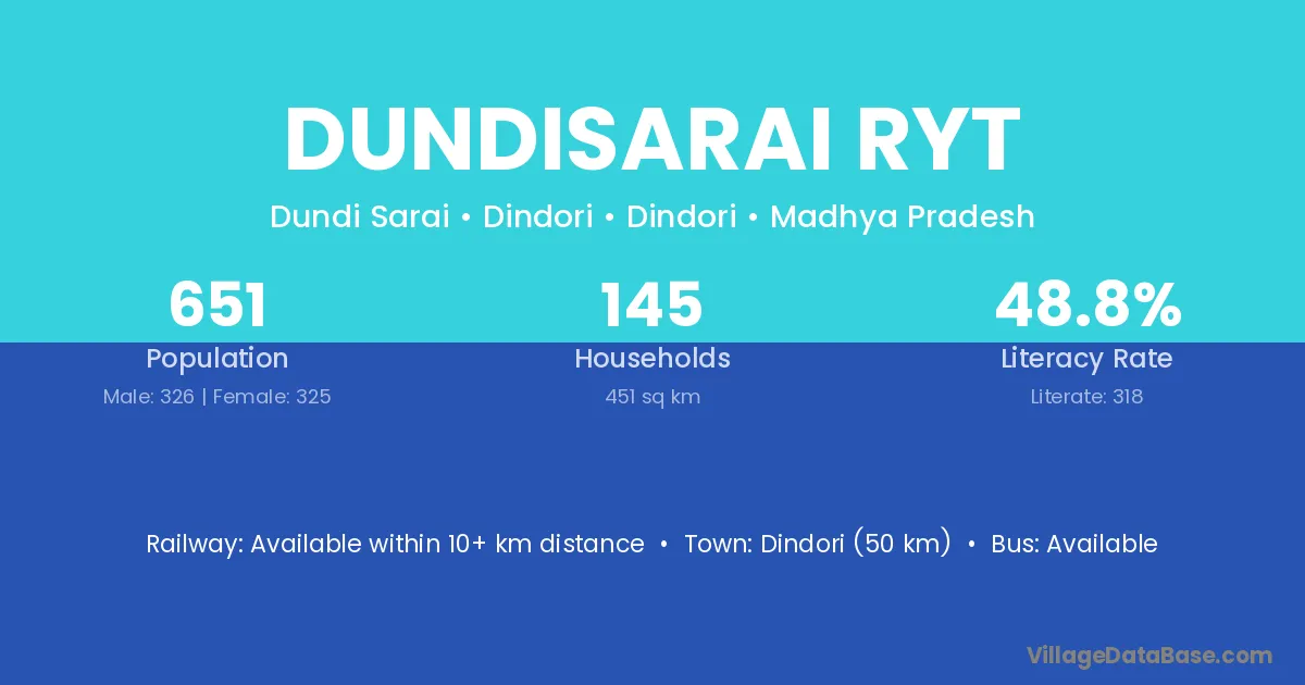 Dundisarai Ryt village has a total population of 651 people, of which 326 are males and 325 are females.