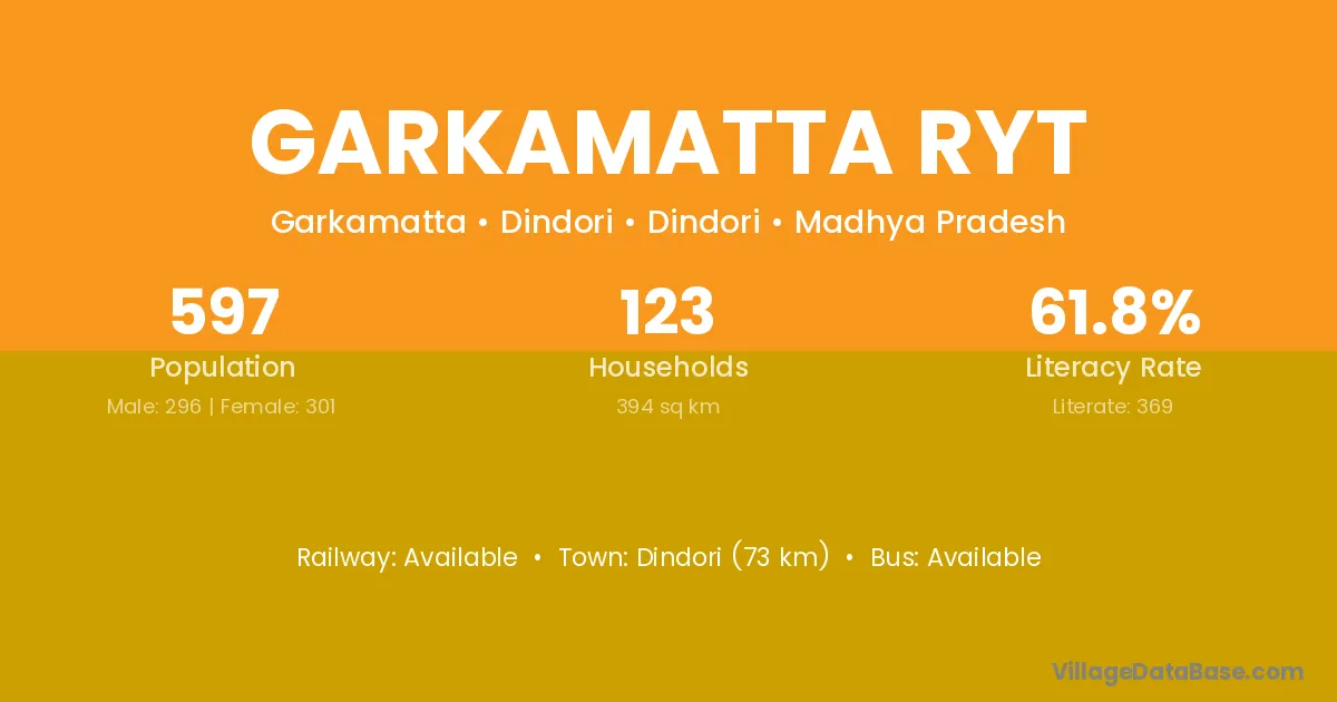 Dindori (73 km) is the nearest town to Garkamatta Ryt village for major economic activities and is located approximately 73 km away.