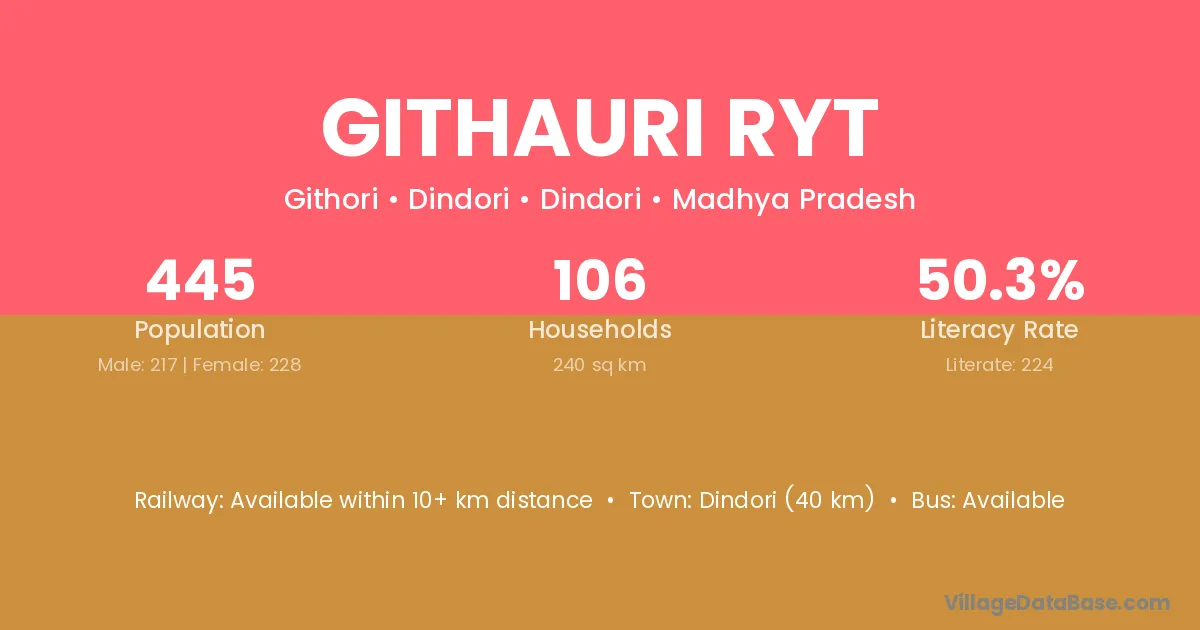 Githauri Ryt village has a total population of 445 people, of which 217 are males and 228 are females.