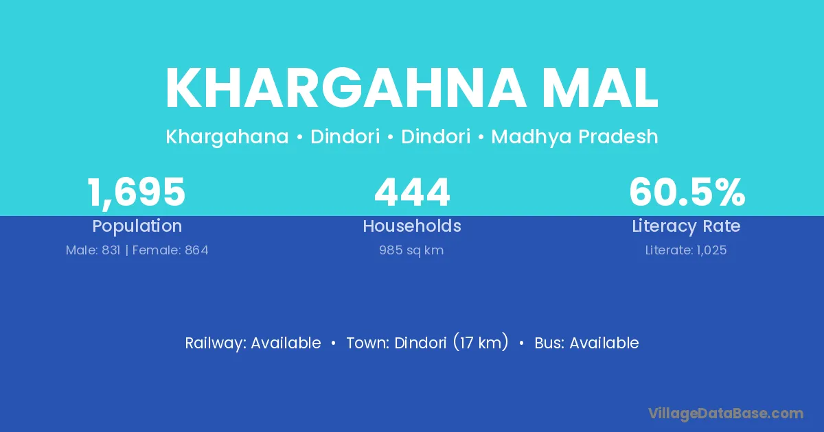 Dindori (17 km) is the nearest town to Khargahna Mal village for major economic activities and is located approximately 17 km away.