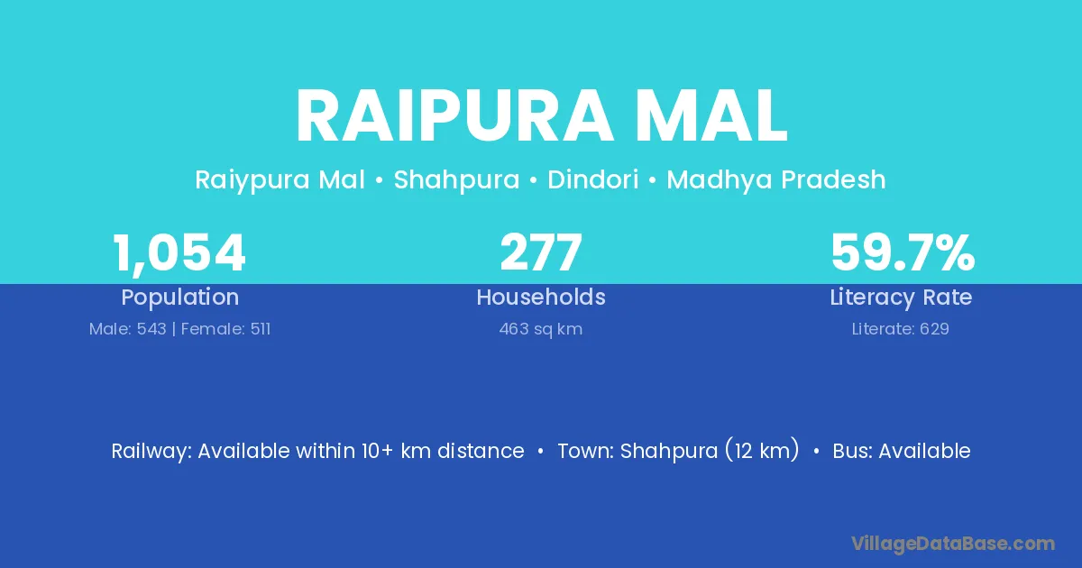Dindori (9 km) is the nearest town to Raipura Mal village for major economic activities and is located approximately 9 km away.