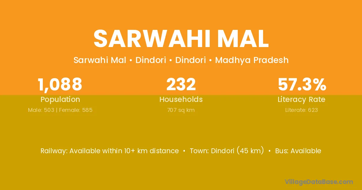 Dindori (45 km) is the nearest town to Sarwahi Mal village for major economic activities and is located approximately 45 km away.