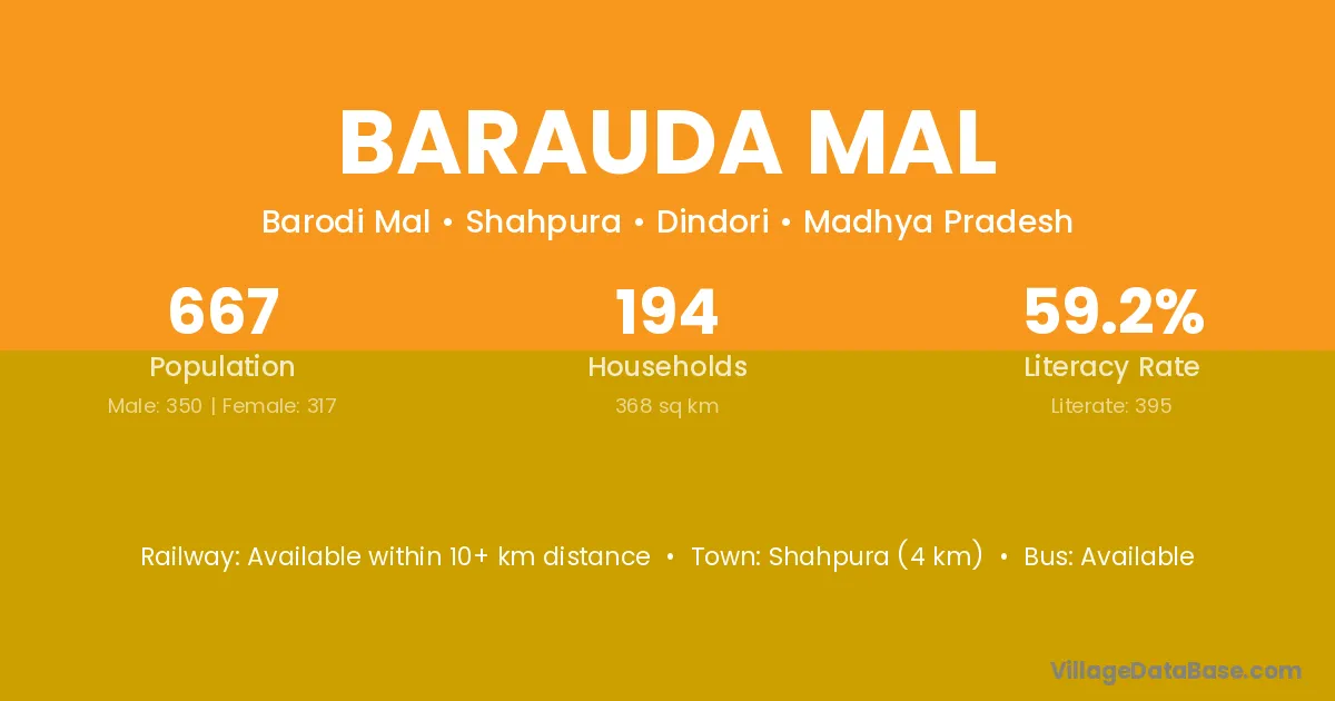 Barauda Mal village has a total population of 667 people, of which 350 are males and 317 are females.