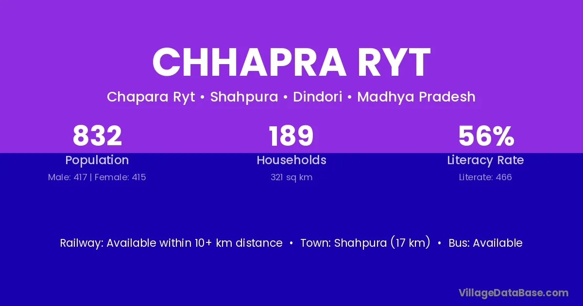 Chhapra Ryt village has a total population of 832 people, of which 417 are males and 415 are females.