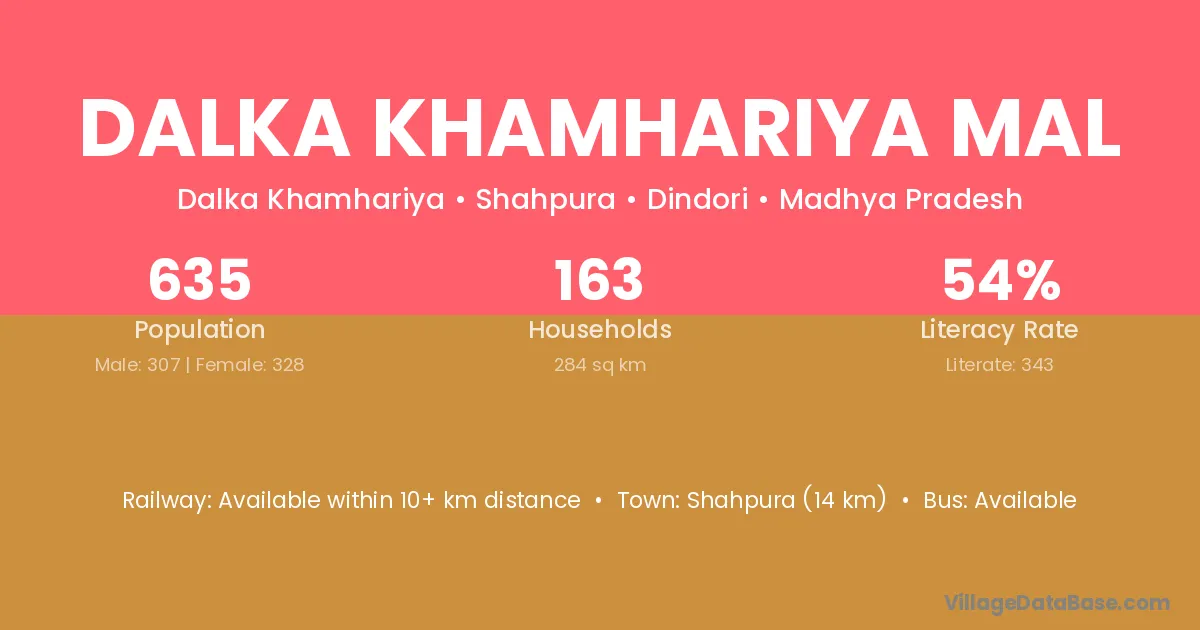Dalka Khamhariya Mal village has a total population of 635 people, of which 307 are males and 328 are females.