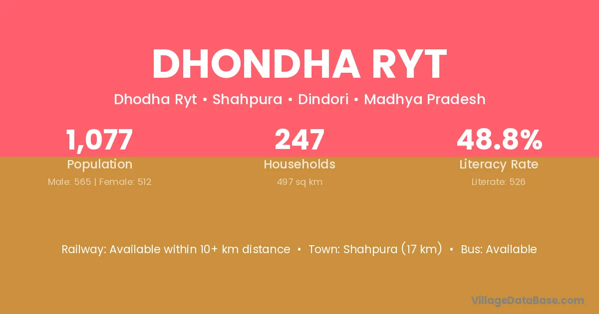Dhondha Ryt village has a total population of 1,077 people, of which 565 are males and 512 are females.