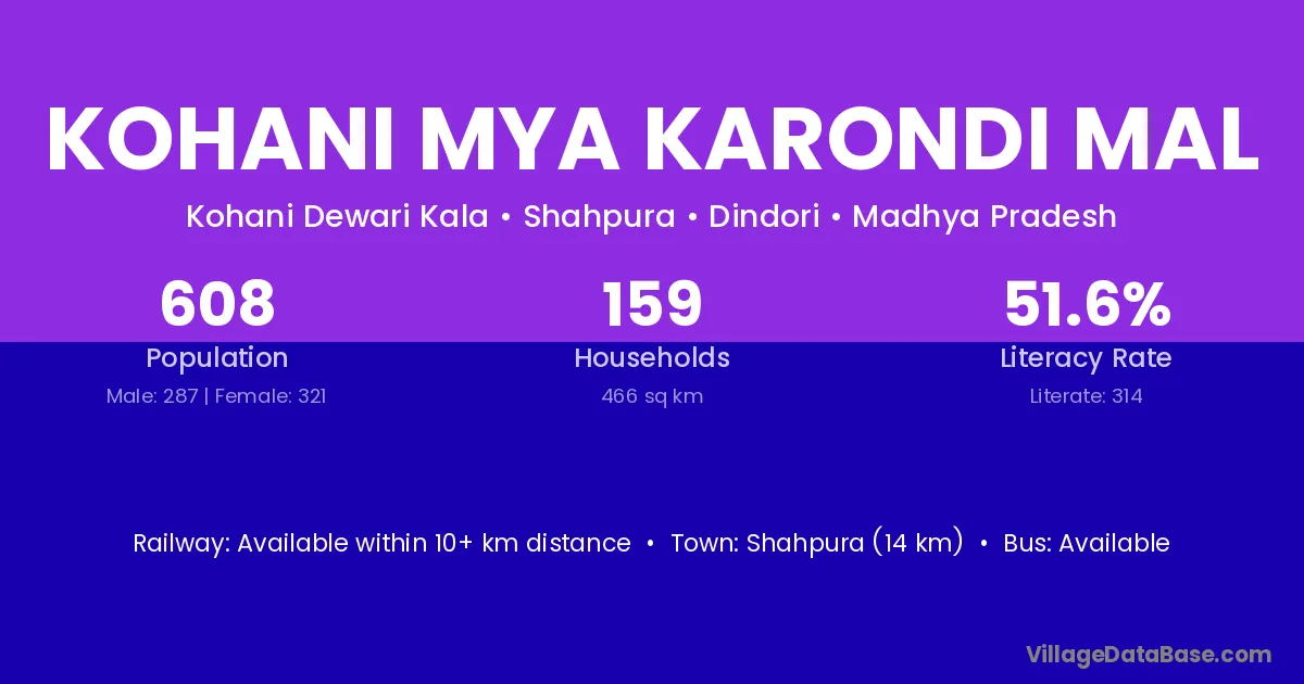 Kohani Mya Karondi Mal village has a total population of 608 people, of which 287 are males and 321 are females.