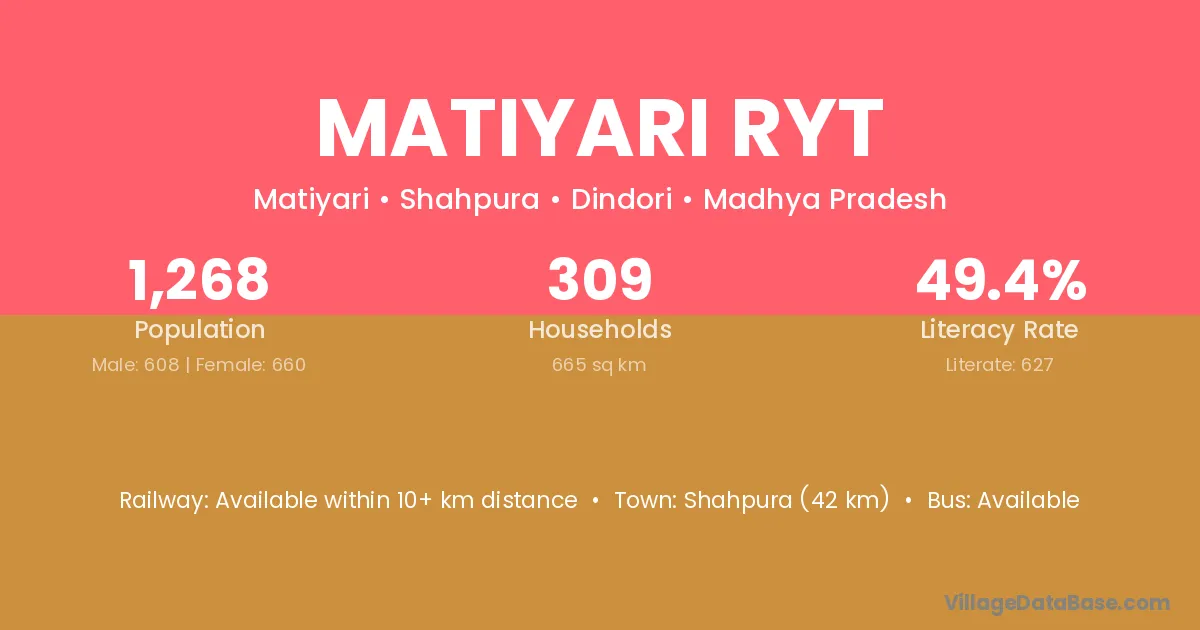 Matiyari Ryt village has a total population of 1,268 people, of which 608 are males and 660 are females.