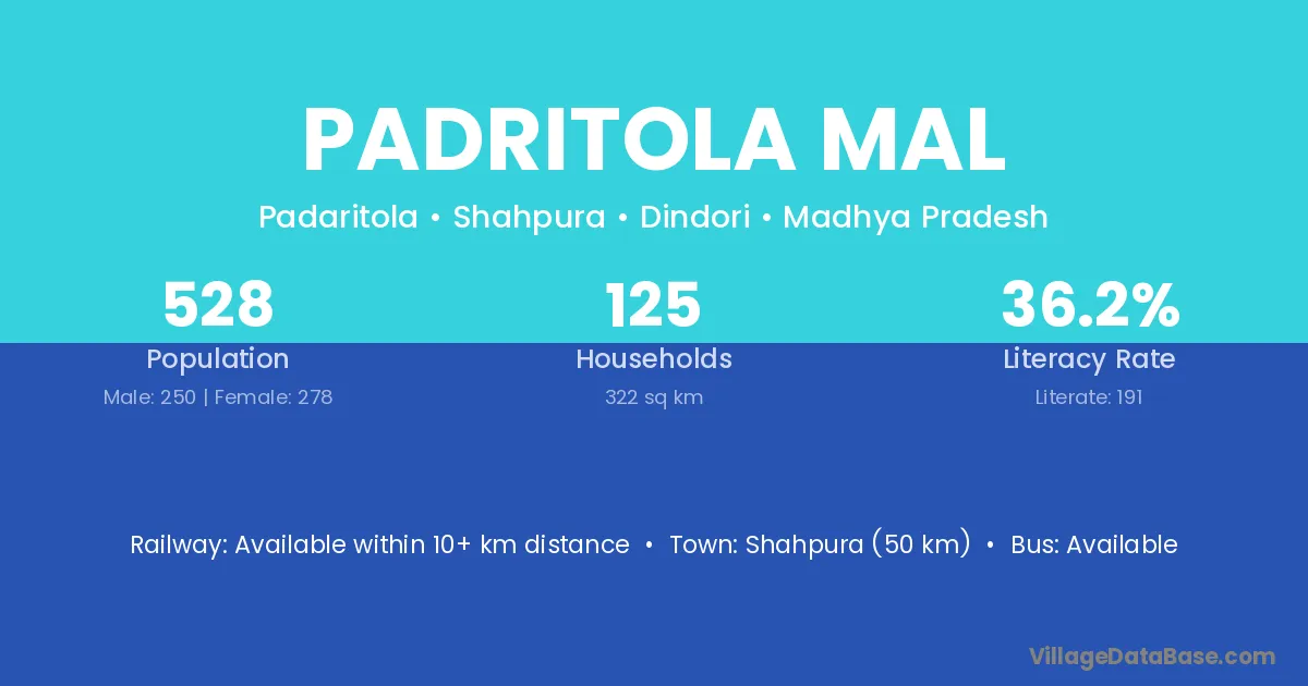 Shahpura (50 km) is the nearest town to Padritola Mal village for major economic activities and is located approximately 50 km away.
