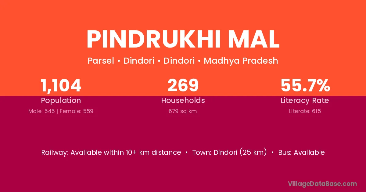 Dindori (62 km) is the nearest town to Pindrukhi Mal village for major economic activities and is located approximately 62 km away.