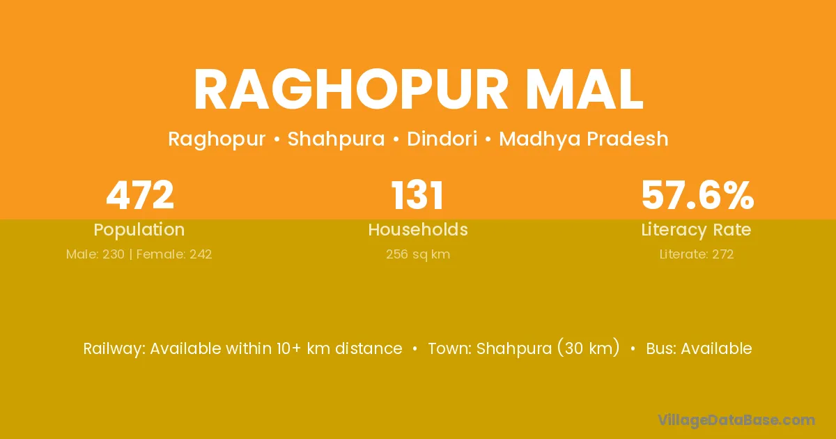 Raghopur Mal village has a total population of 472 people, of which 230 are males and 242 are females.