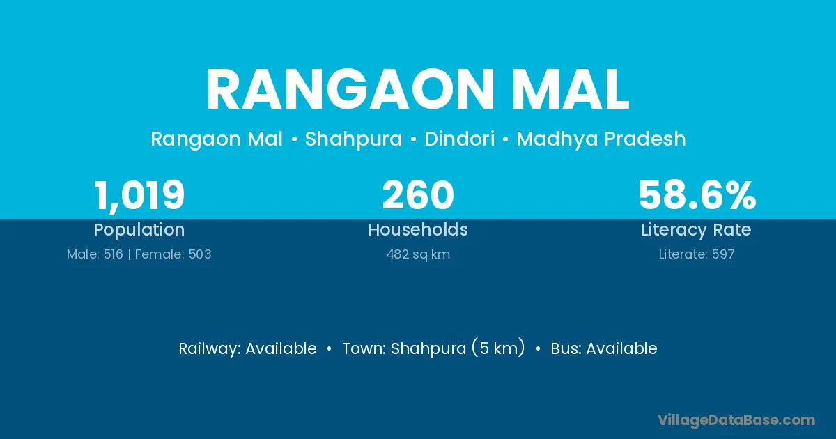 Rangaon Mal village has a total population of 1,019 people, of which 516 are males and 503 are females.