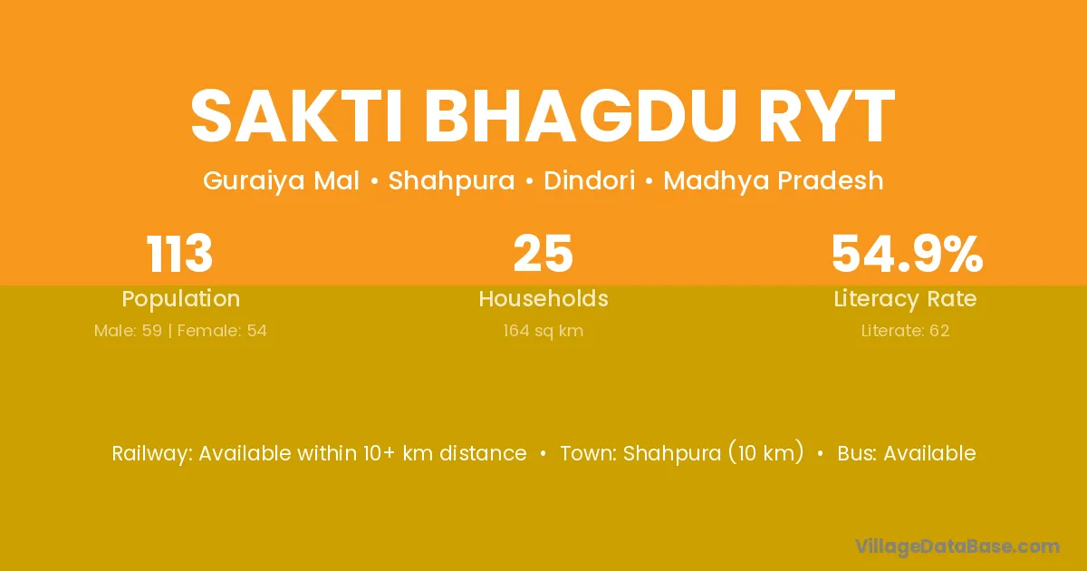 Sakti Bhagdu Ryt village has a total population of 113 people, of which 59 are males and 54 are females.