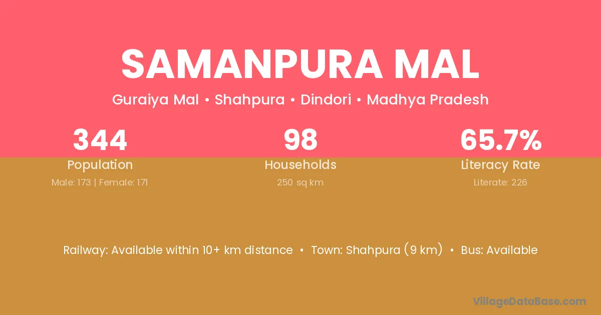 Samanpura Mal village has a total population of 344 people, of which 173 are males and 171 are females.