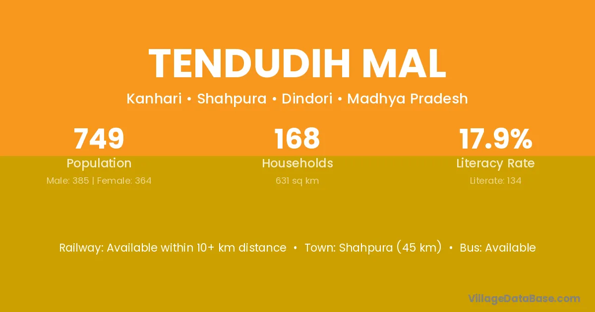 Tendudih Mal village has a total population of 749 people, of which 385 are males and 364 are females.