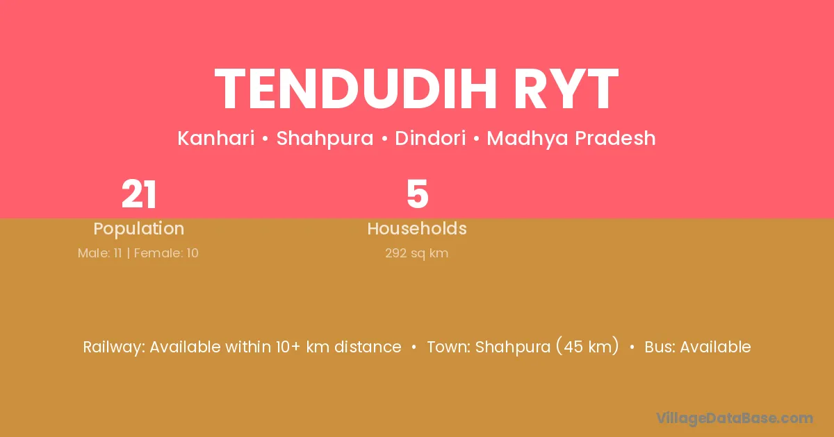 Tendudih Ryt village has a total population of 21 people, of which 11 are males and 10 are females.