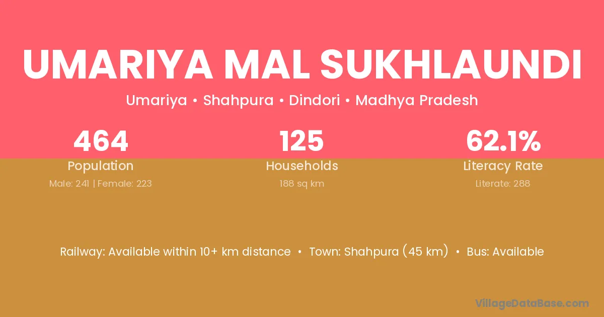 Umariya Mal Sukhlaundi village has a total population of 464 people, of which 241 are males and 223 are females.