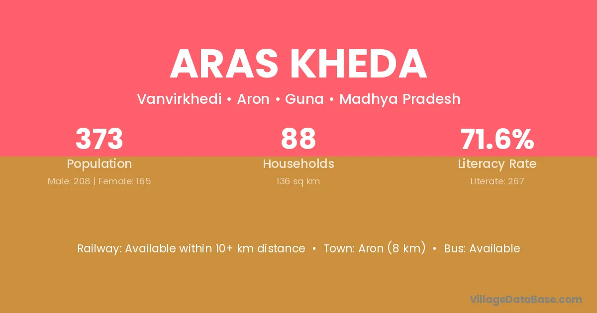 Aron (8 km) is the nearest town to Aras Kheda village for major economic activities and is located approximately 8 km away.