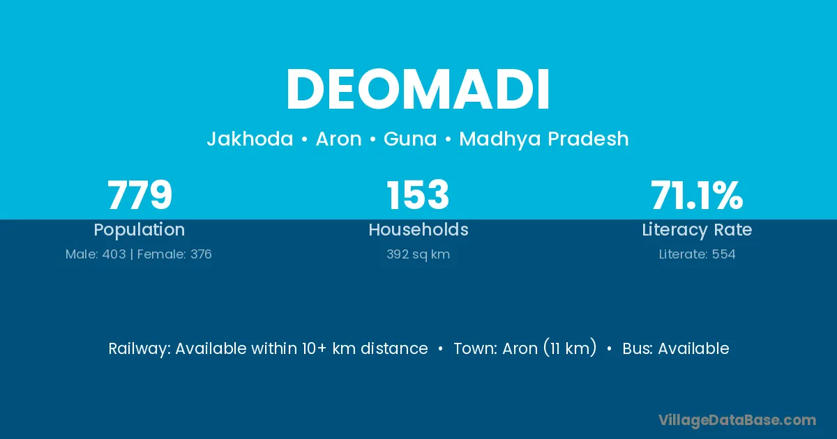 Aron (11 km) is the nearest town to Deomadi village for major economic activities and is located approximately 11 km away.