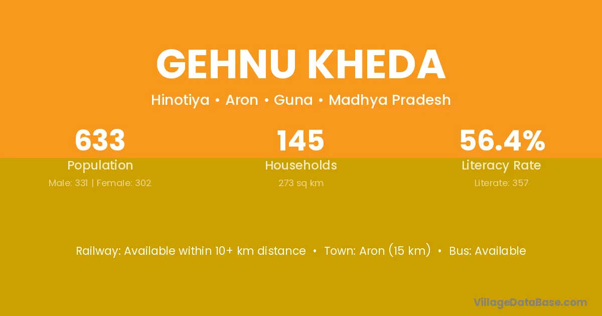 Gehnu Kheda village has a total population of 633 people, of which 331 are males and 302 are females.
