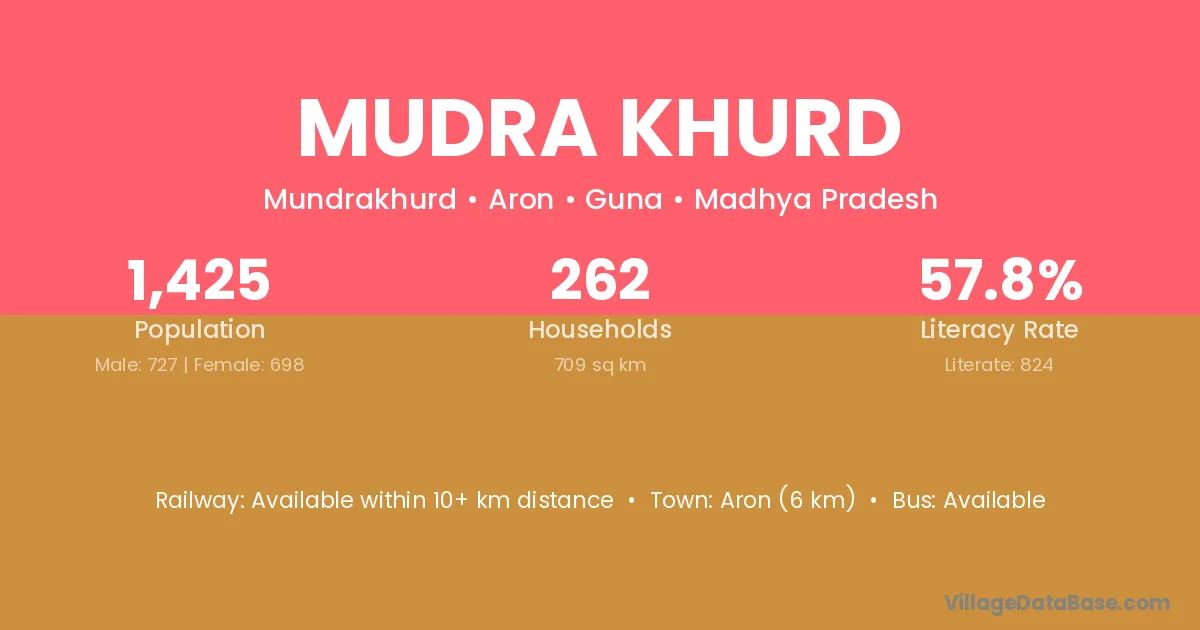 Aron (6 km) is the nearest town to Mudra Khurd village for major economic activities and is located approximately 6 km away.