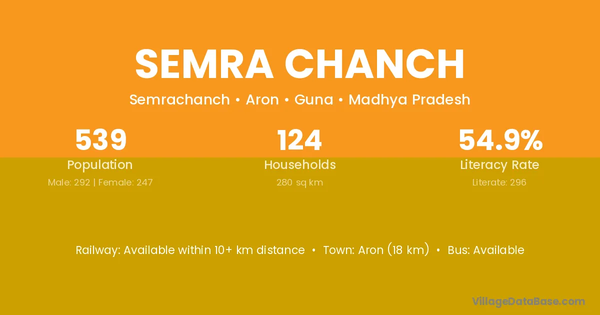 Aron (18 km) is the nearest town to Semra Chanch village for major economic activities and is located approximately 18 km away.