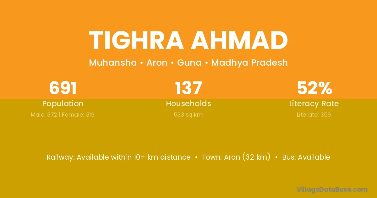 Aron (32 km) is the nearest town to Tighra Ahmad village for major economic activities and is located approximately 32 km away.