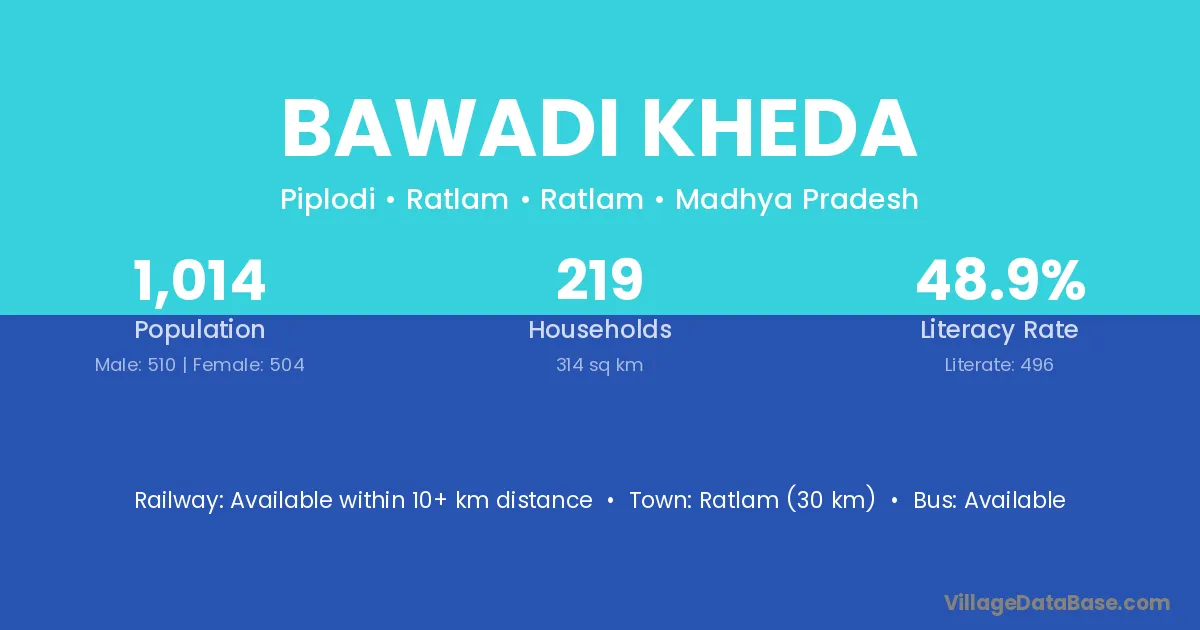The literacy rate of Bawadi Kheda village is 31.91%. Male literacy stands at 42.02% and female literacy at 21.08%.