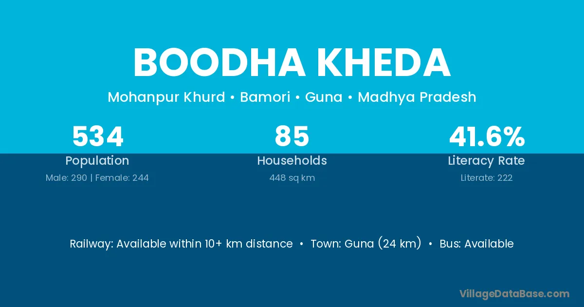 Guna (24 km) is the nearest town to Boodha Kheda village for major economic activities and is located approximately 24 km away.