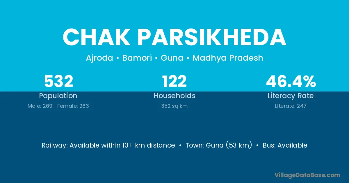 Chak Parsikheda village has a total population of 532 people, of which 269 are males and 263 are females.