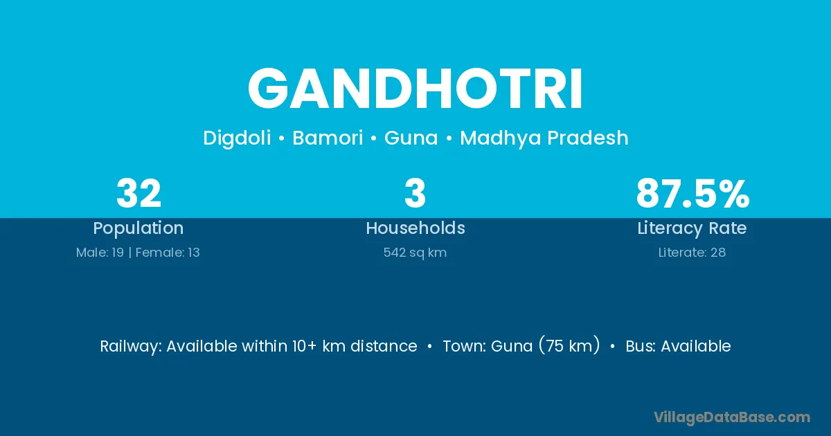 Guna (75 km) is the nearest town to Gandhotri village for major economic activities and is located approximately 75 km away.
